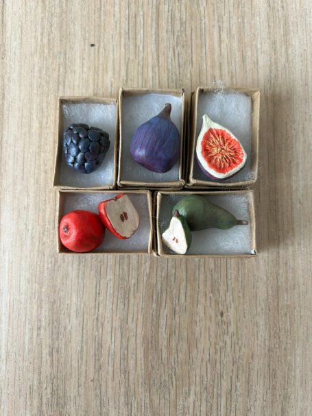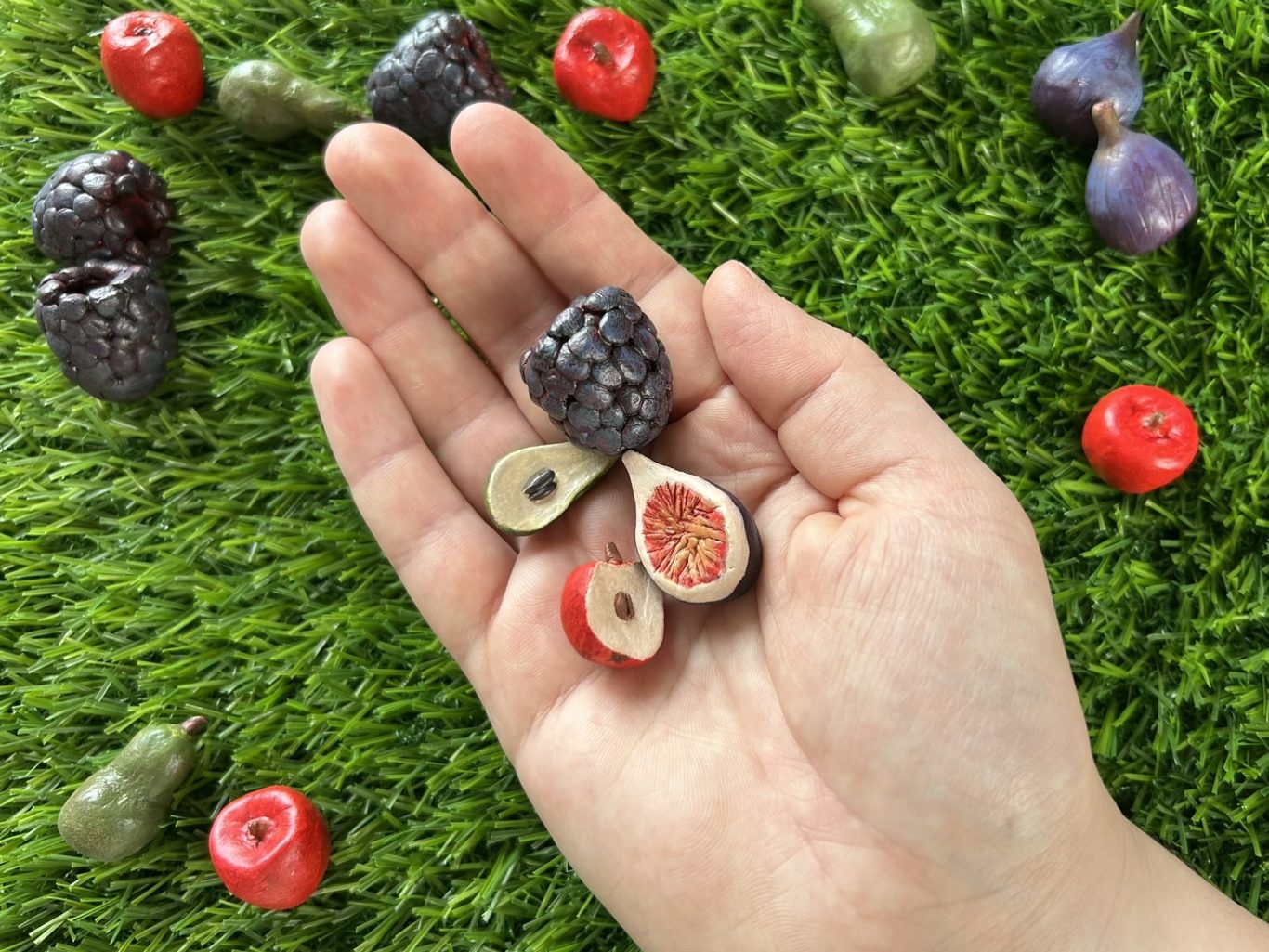 Handmade miniature hand-painted airdry clay fruits, are now available on her Etsy shop: